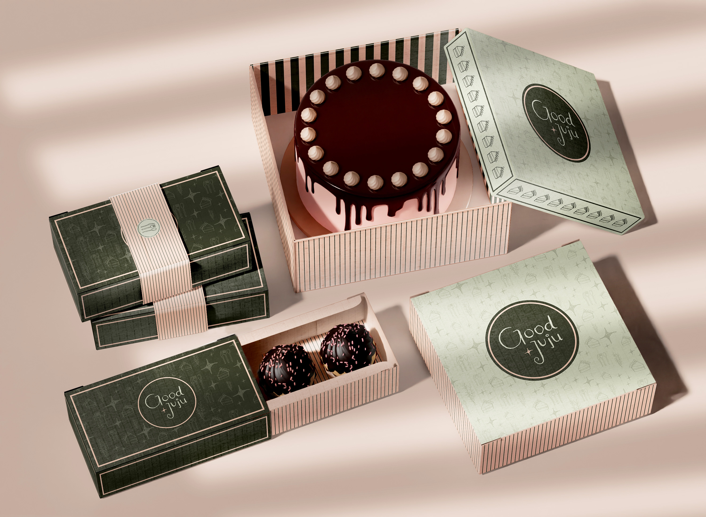 With the final logo selected, I began playing with the chosen brand icons. With one, the star, being included in the logo itself, the owner and I still wanted to incorporate the other icons throughout the brand. As they all have a similar whimsy, I made a pattern that included each one, varying in size, direction, and frequency. I utilized this pattern in many designs such as the introductory Instagram posts below, meant to introduce Good Juju to the social platform. Besides the pattern, the owner and I decided each icon could be put to use depending on the given product / package. For example, if customers purchase a cake from Good Juju their cake package would display the cake slice icon, and if customers were to purchase a catering package, their packaging would display the utensil set, etcetera.