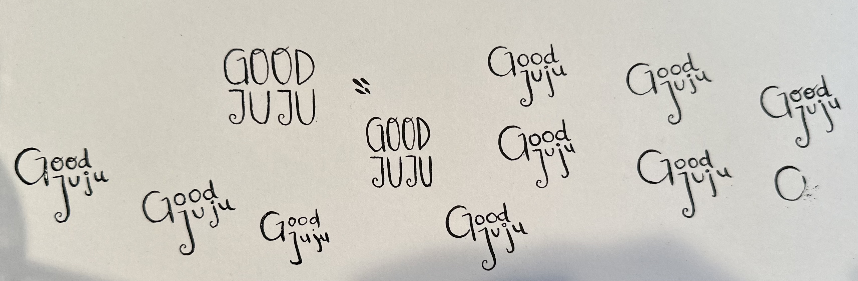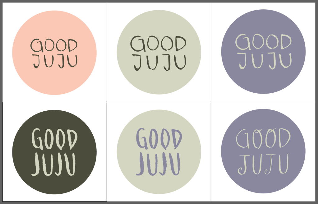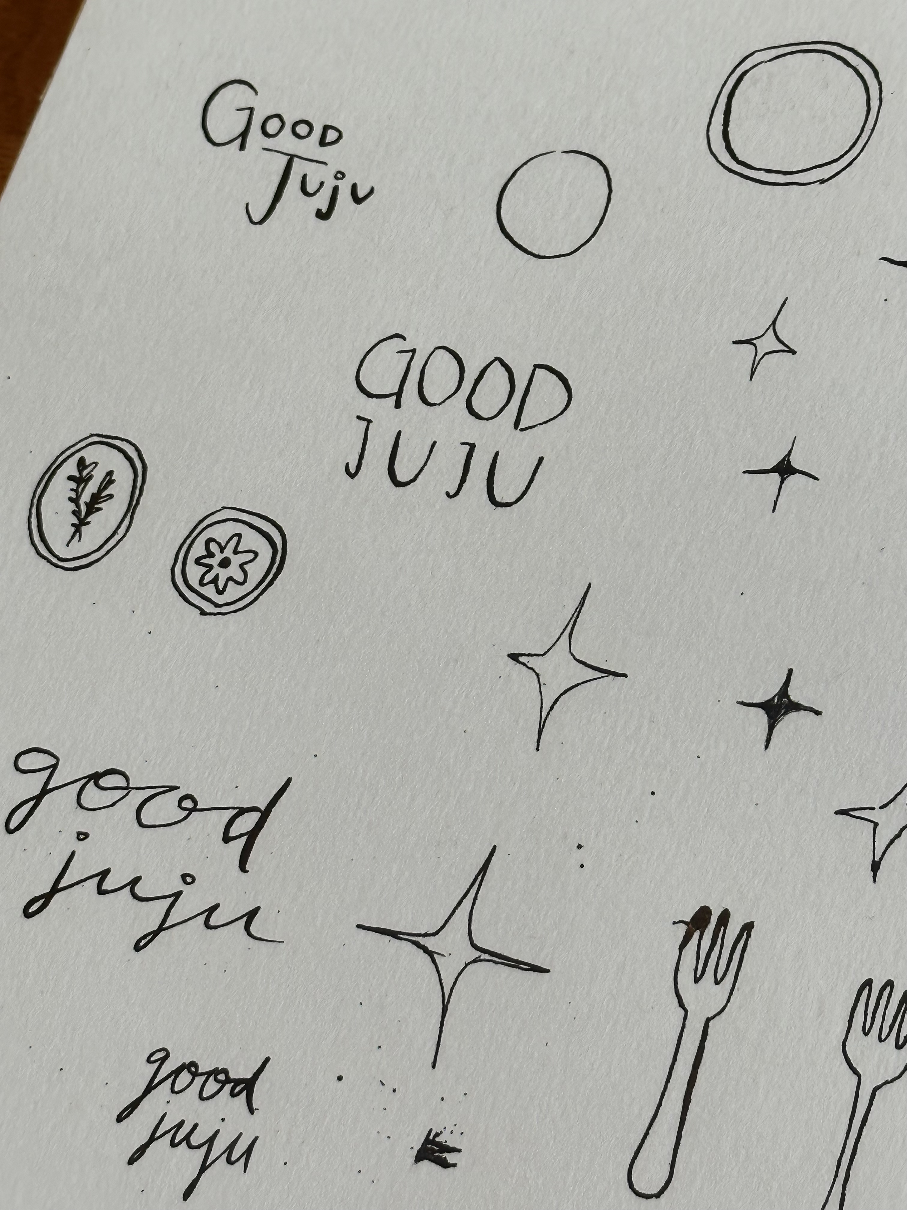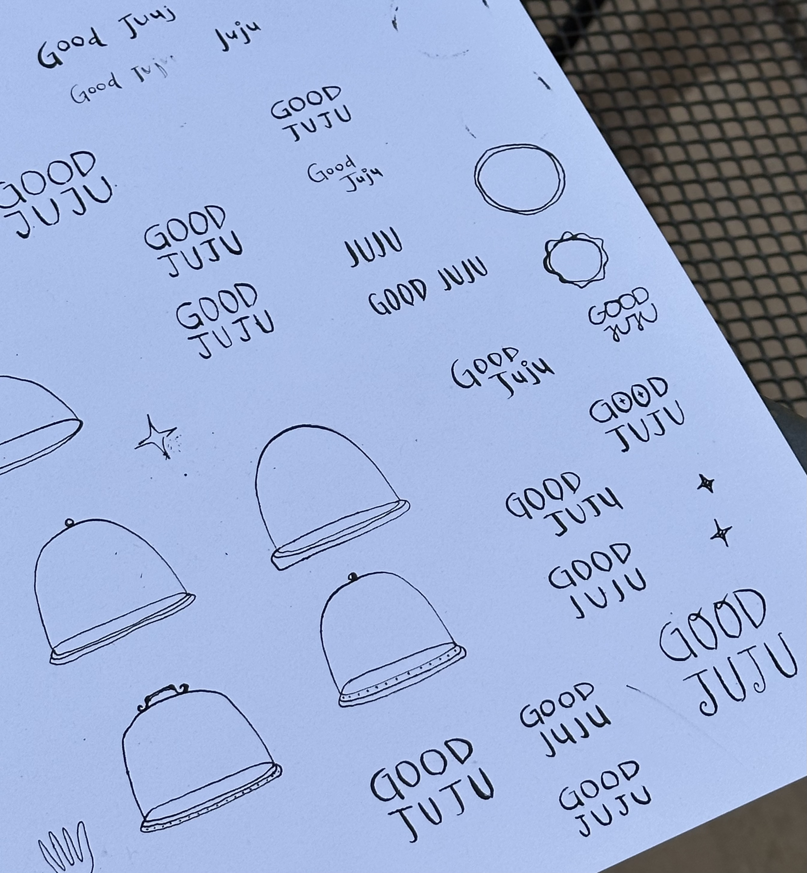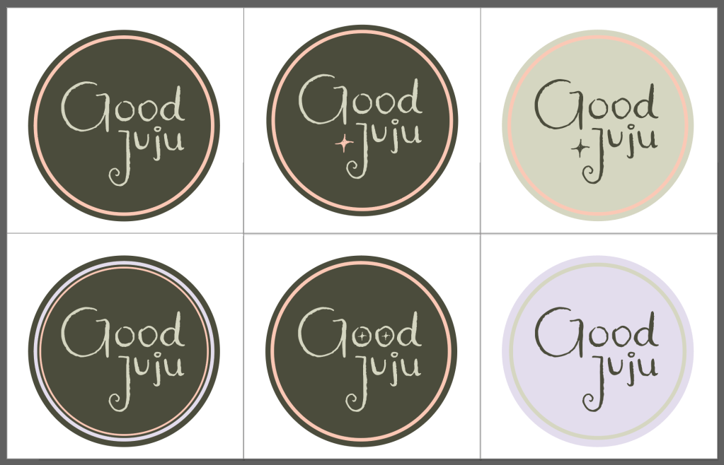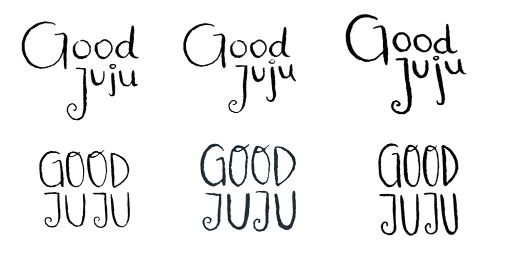 After reviewing these initial ideas, Good Juju’s owner favored the topmost color palette idea, and the first (from the top), third, fourth, and fifth typeface ideas. My next step was then to start drafting hand-drawn logos.