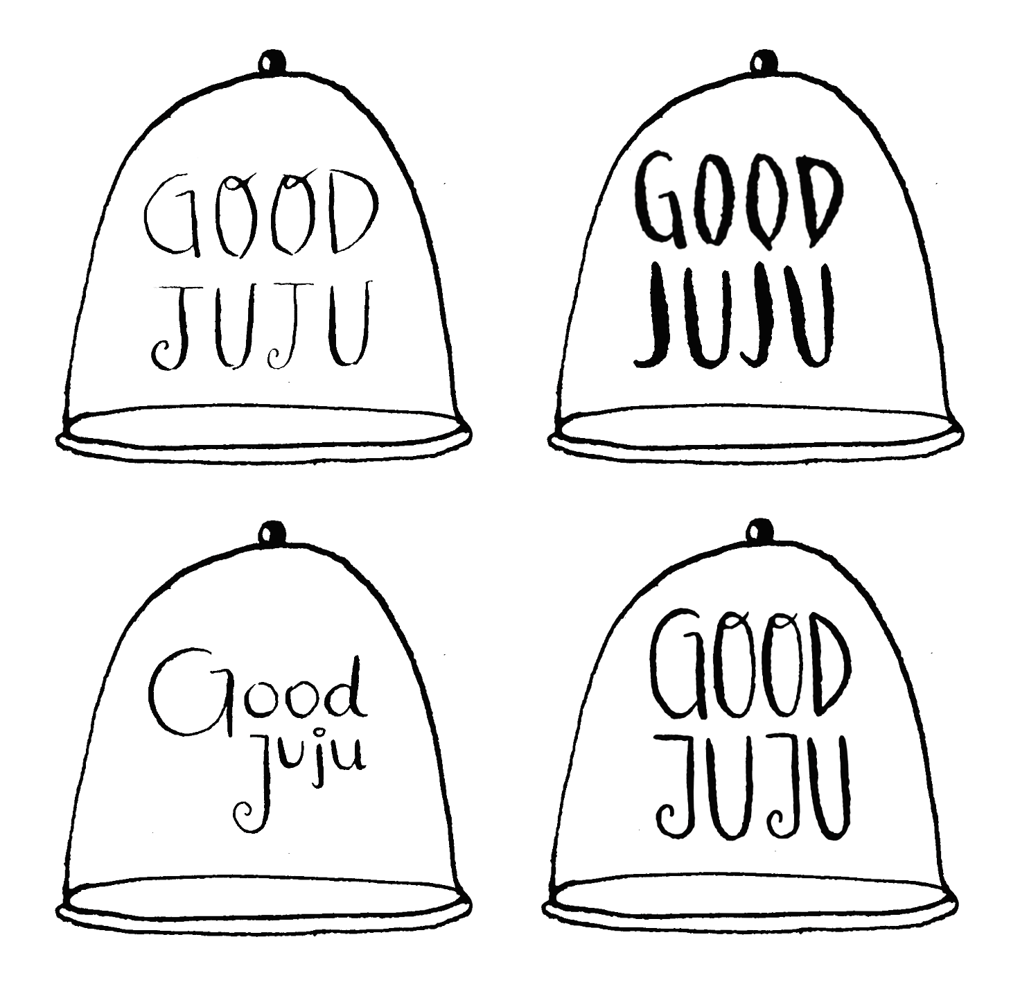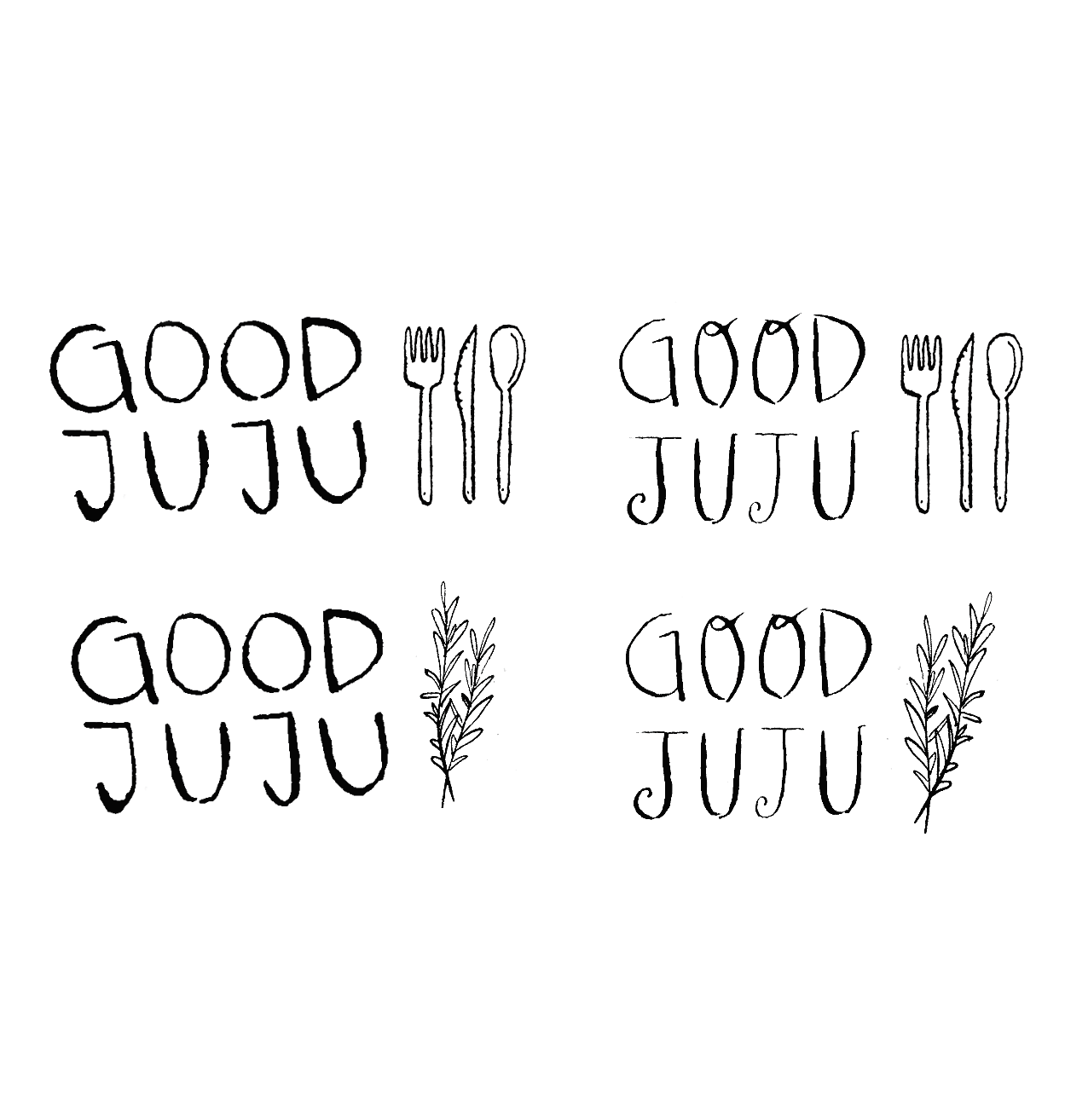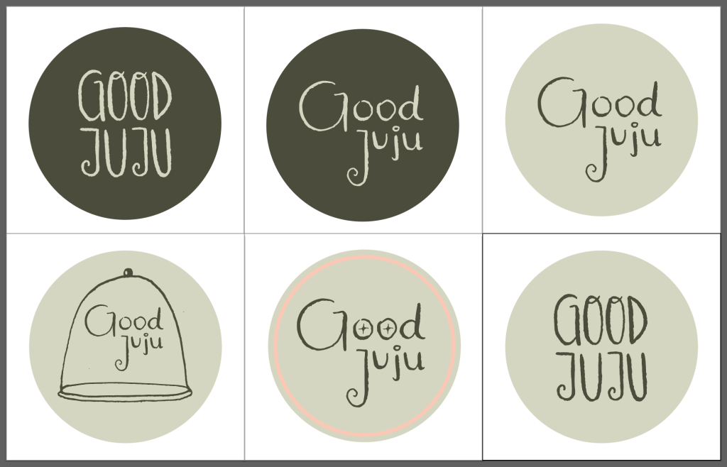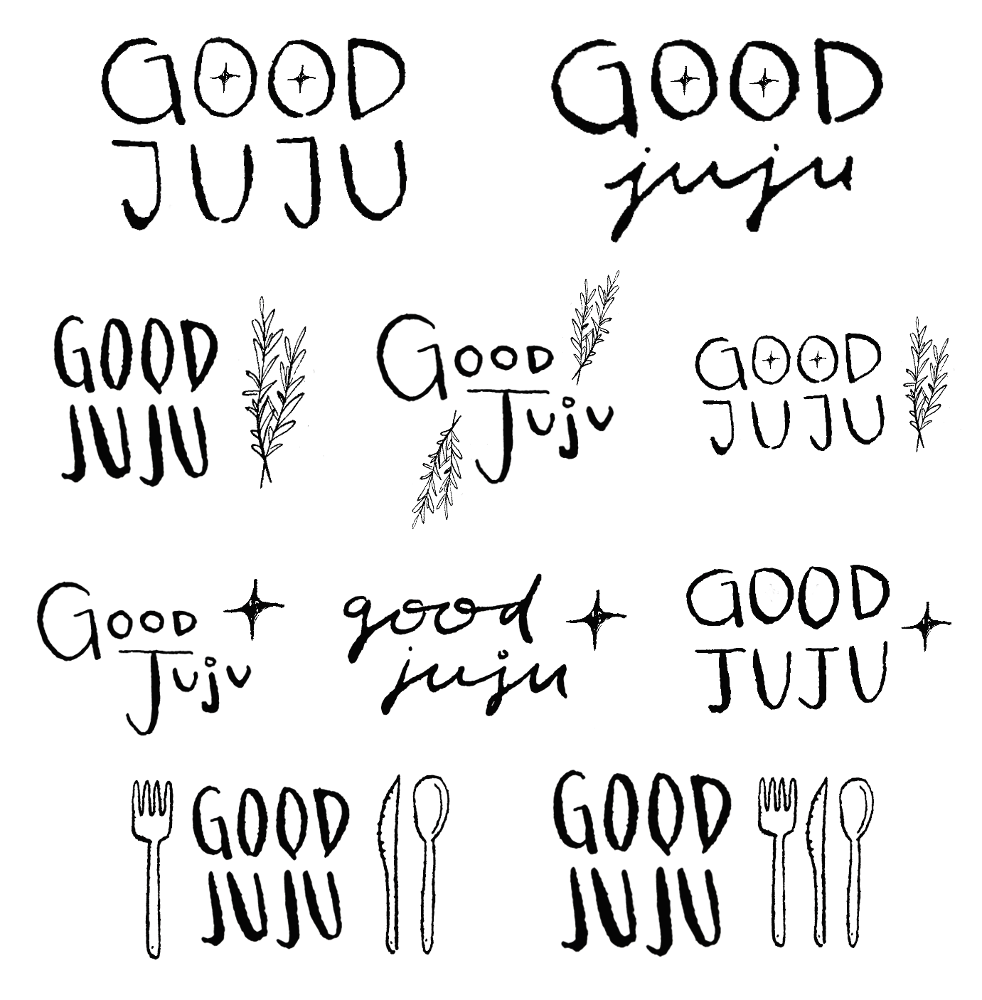 After drawing dozens of variations with different feels, I scanned the best of the bunch to pitch to Good Juju’s owner. Bringing them into photoshop, I made sure each logo was darkened and “cleaned up,” tweaking them to be conducive to the brand’s ethos.