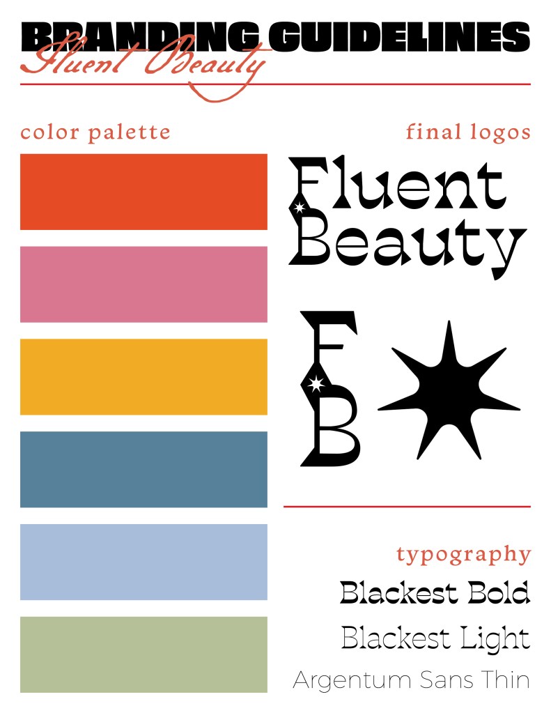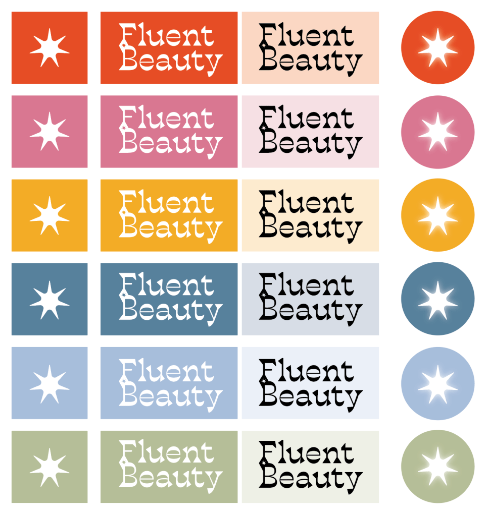 My first ideas were proving to be the favorites for Fluent’s owner, as she wanted to keep working on the top left logo. This logo utlized a negative space star that connected “Fluent” to “Beauty.” So, my next step was playing with the star itself. See below a few of the designs.