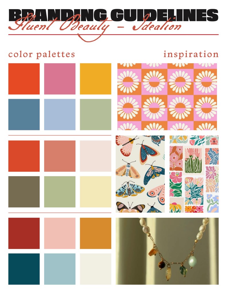 Fluent Beauty, a small women-owned and operated jewelry business, had a problem: their customers had outgrown their branding. Their jewelry was evolving, while their branding was stagnant. Approaching me, Fluent Beauty’s goal was to design all-new branding to artfully curate a new, lively brand feeling. With their main selling platform being reached via Instagram, this branding needed to be eye-catching within today’s slew of social media marketing, whilst still maintaining its ethos as a trusted and beloved brand. Take a look at the brand’s previous logo as well as my first brainstorming steps below.