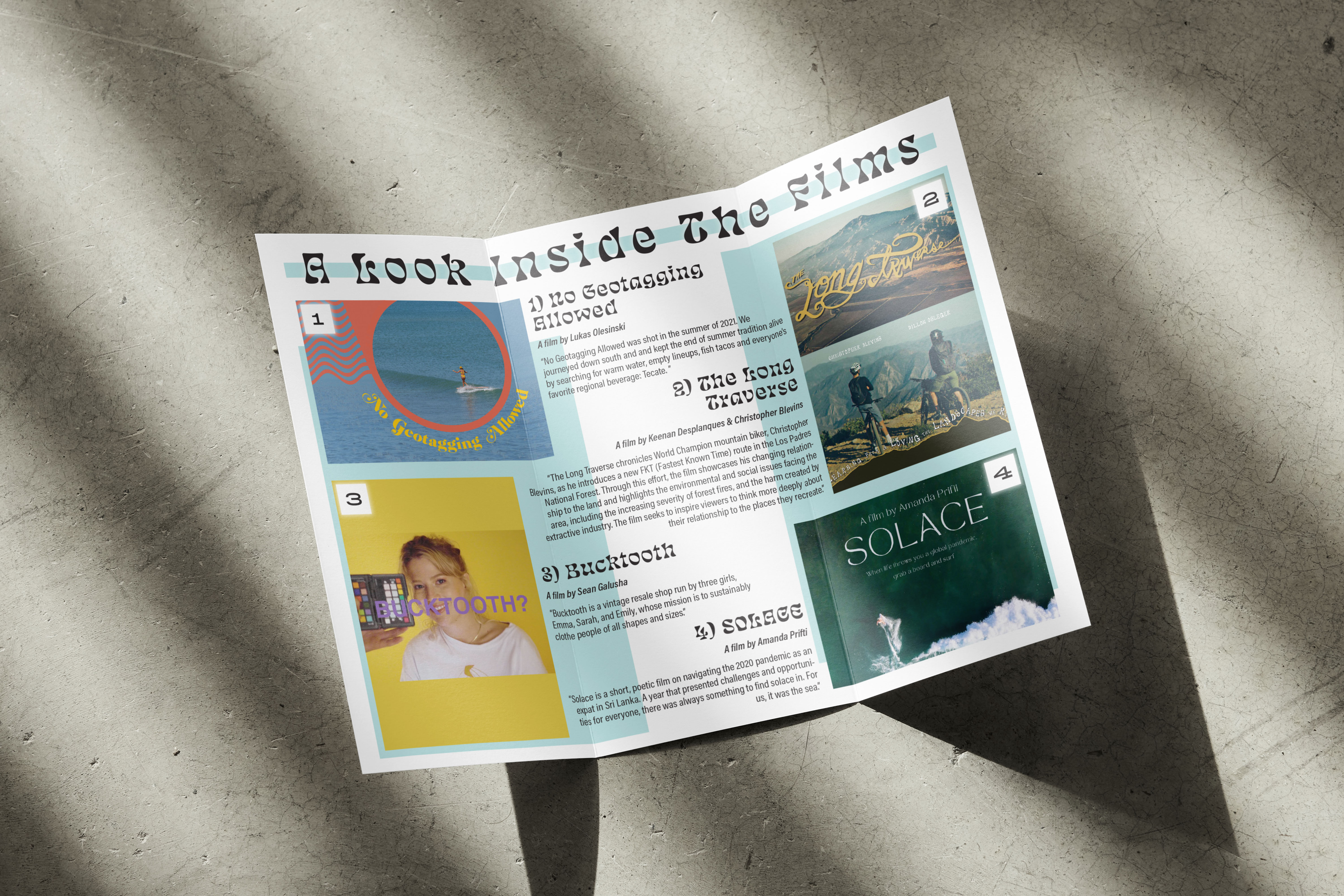 During my years at Cal Poly I had the great opportunity to work with the Surfrider Foundation, specifically the student-run Cal Poly club chapter. In this club I was co-head of the education team and a member of the media team. The media team was tasked with designing club advertisements, social media posts, and other promotional materials. One piece I was tasked with creating was a tri-fold program for Cal Poly Surfrider’s annual Make Waves Film Festival. With four films submitted and many sponsors, see below the inside and outside of the program, respectively.