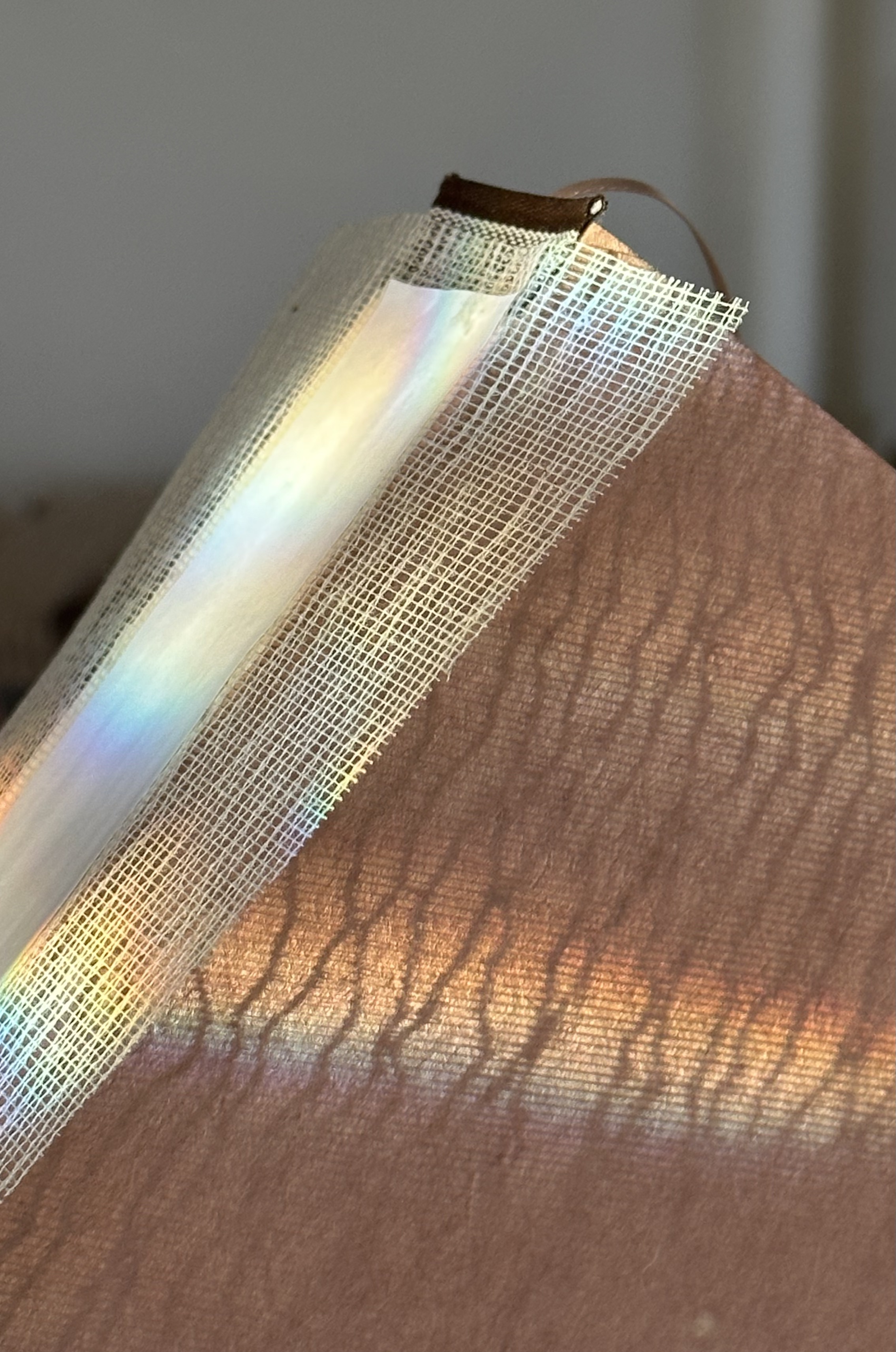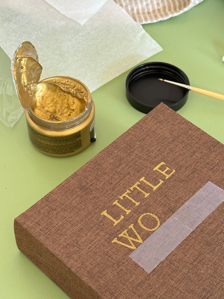 When finished sewing we moved onto creating the book case and end pages. For the binding of the books, I chose a brown book cloth, accented with hand-painted gold titling. I added muted pink bookmark ribbons. For one of the two books, I painted the end pages with golden stripes.