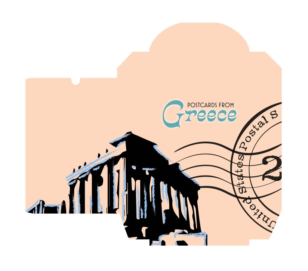 Playing around with postage motifs, I made a postage stamp icon for the card corner symbols. On the front cover of the cards I added a postmark, as if the cards were postcards straight from Greece.