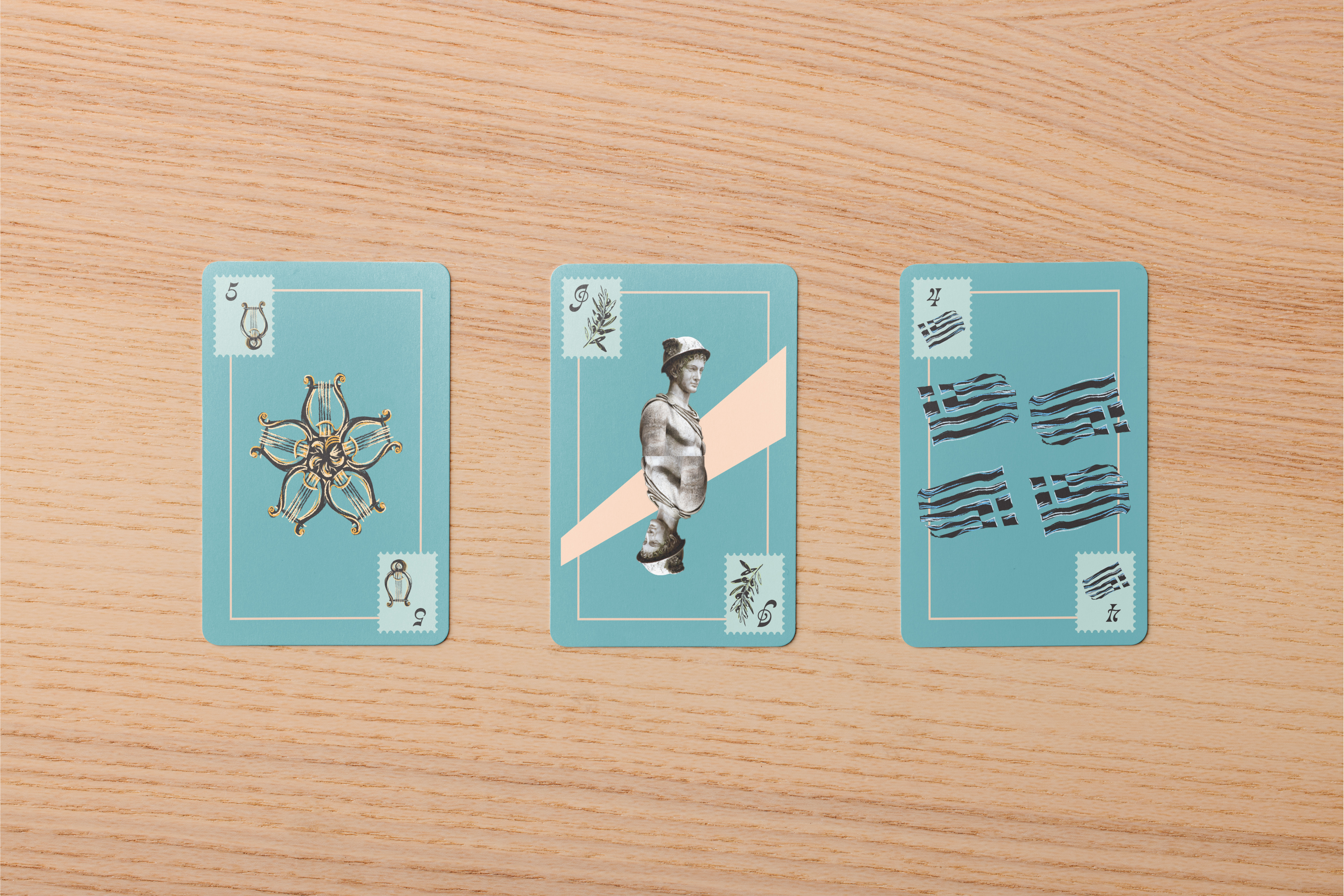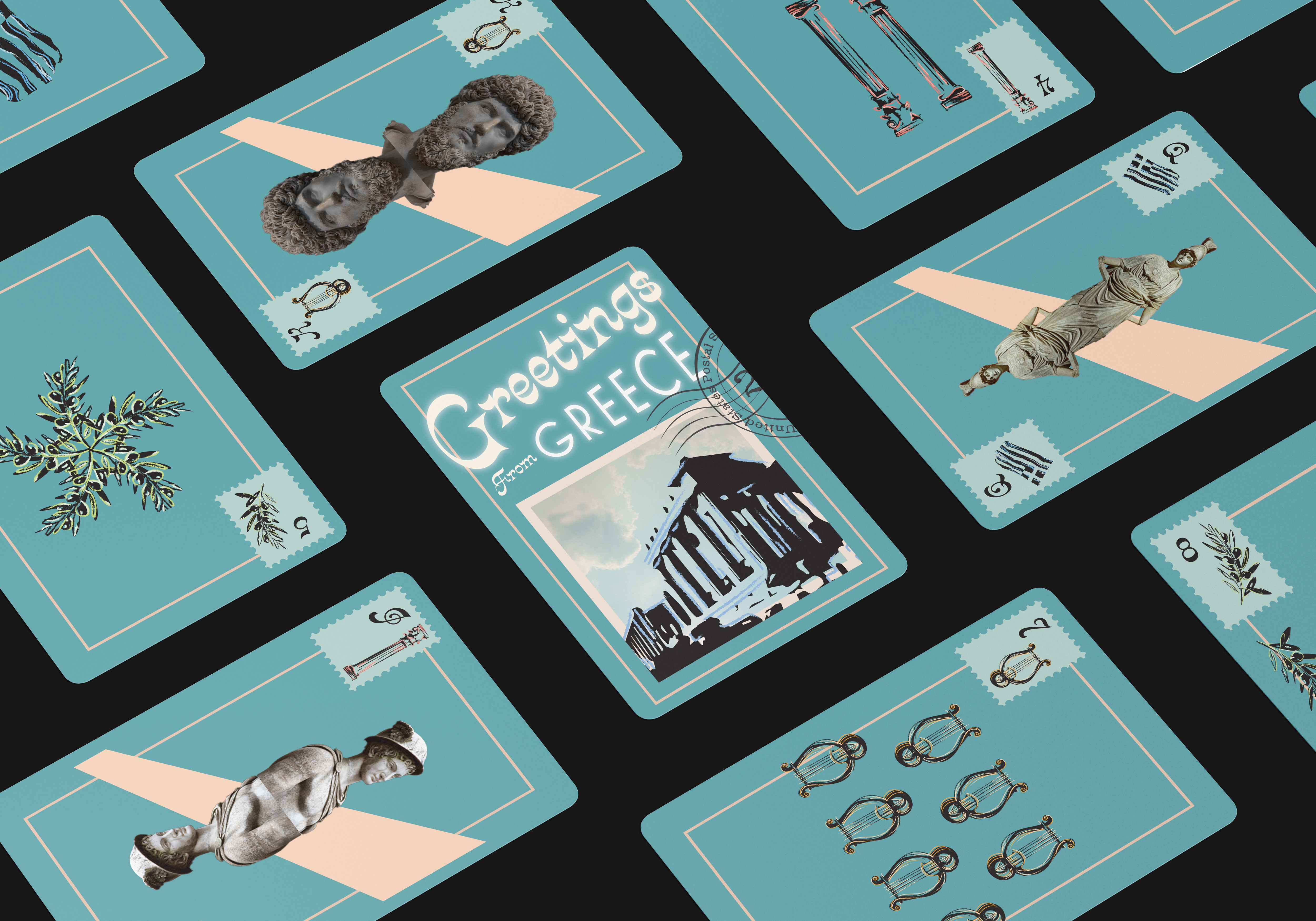 My chosen suits were olive branches, corinthian columns, lyres, and greek flags. I created these symbols with help from the Illustrator brush tool, adding texture and pops of color to the icons. The royalty I chose included Zeus, Athena, and Hermes, another small play on postage.