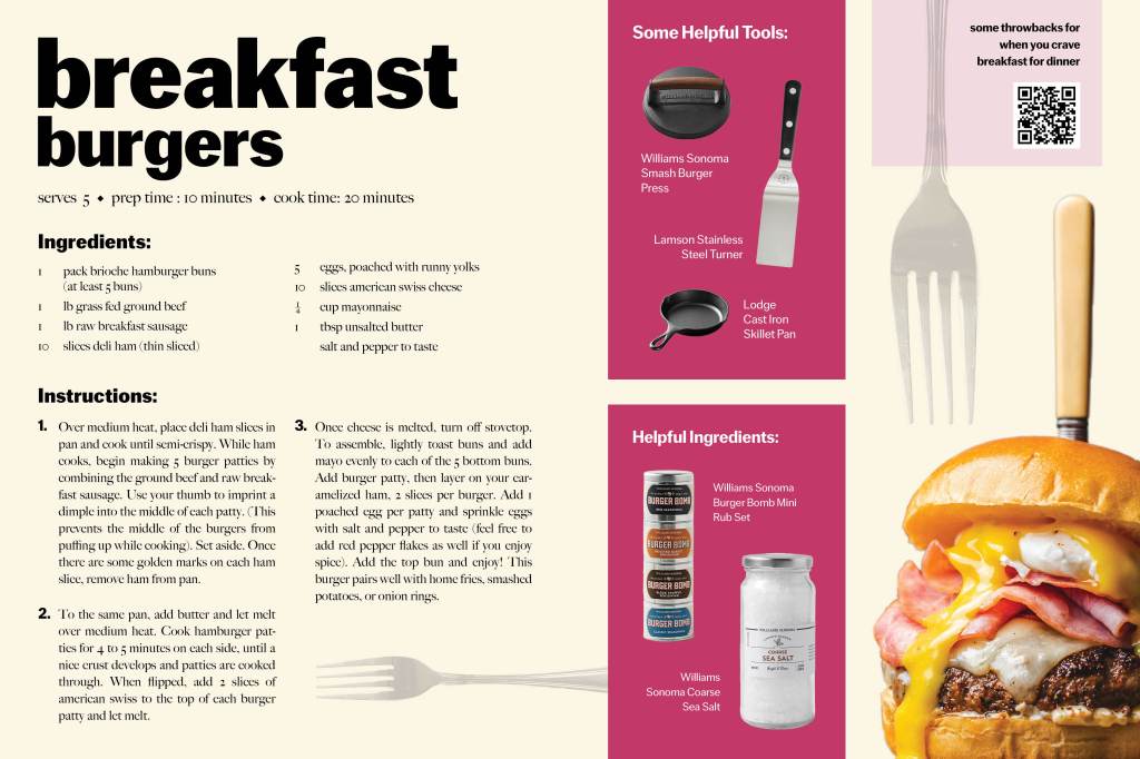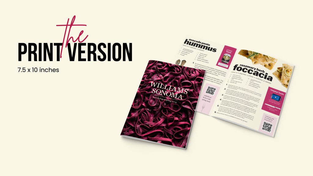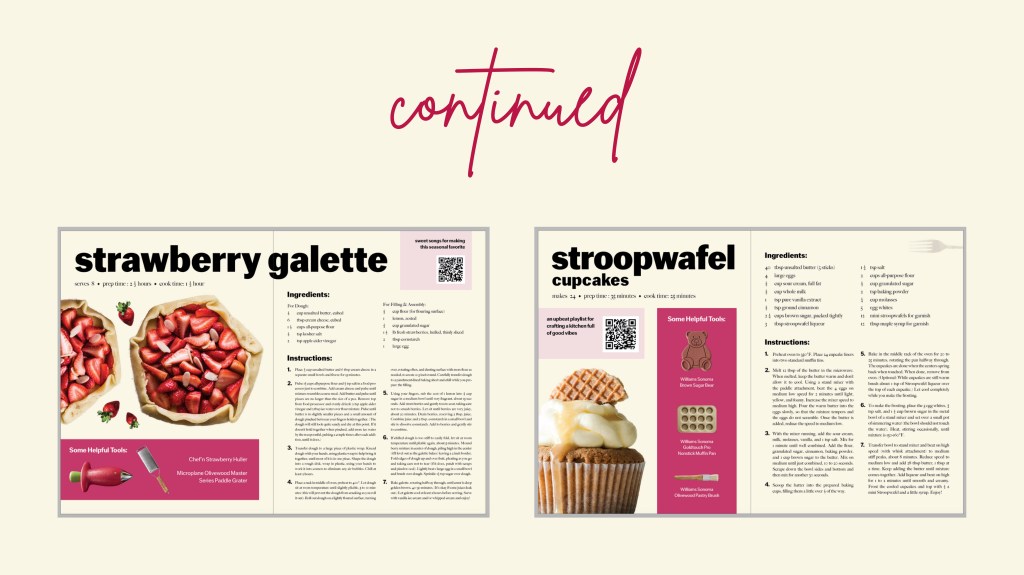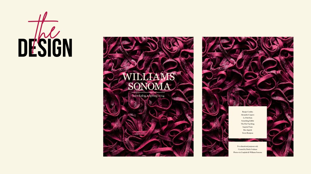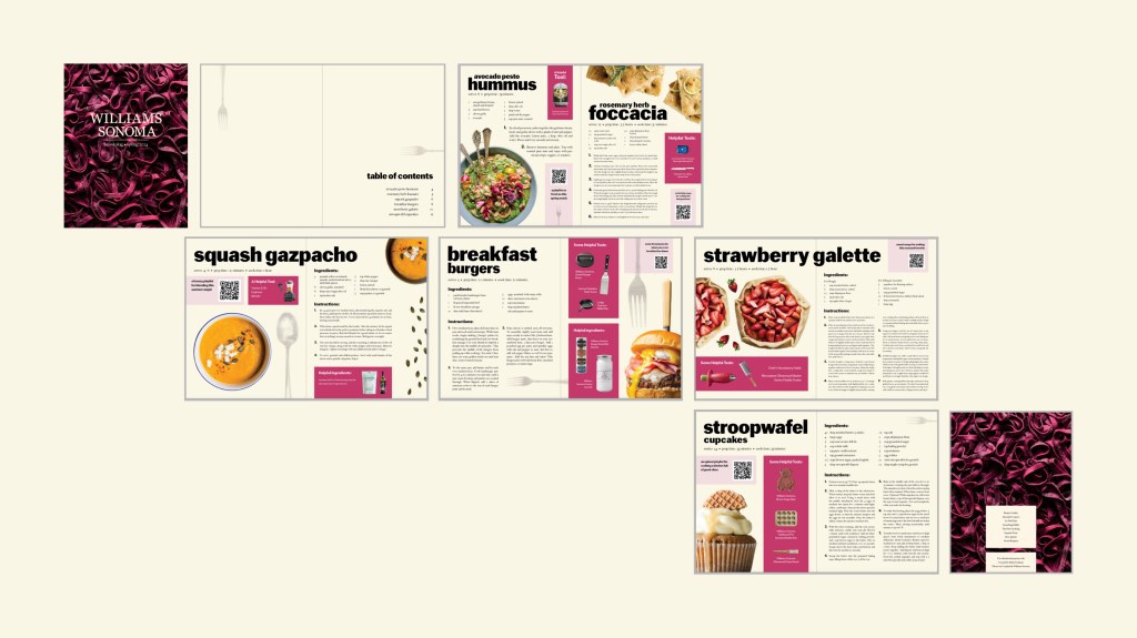 For my senior project, I decided to go about creating a combination of a brand catalog and a cookbook, showcasing Williams Sonoma products in real recipe scenarios. With Williams Sonoma being a globally-recognized brand with loyal followers, I wanted to create something that would attract new, younger customers who may not know much about the brand or its stores. The finished “cookalog” is something that customers would pick up (for free) in-store then take home, able to soon after create their own memorable experiences and dishes, keeping them coming back to the store for more.