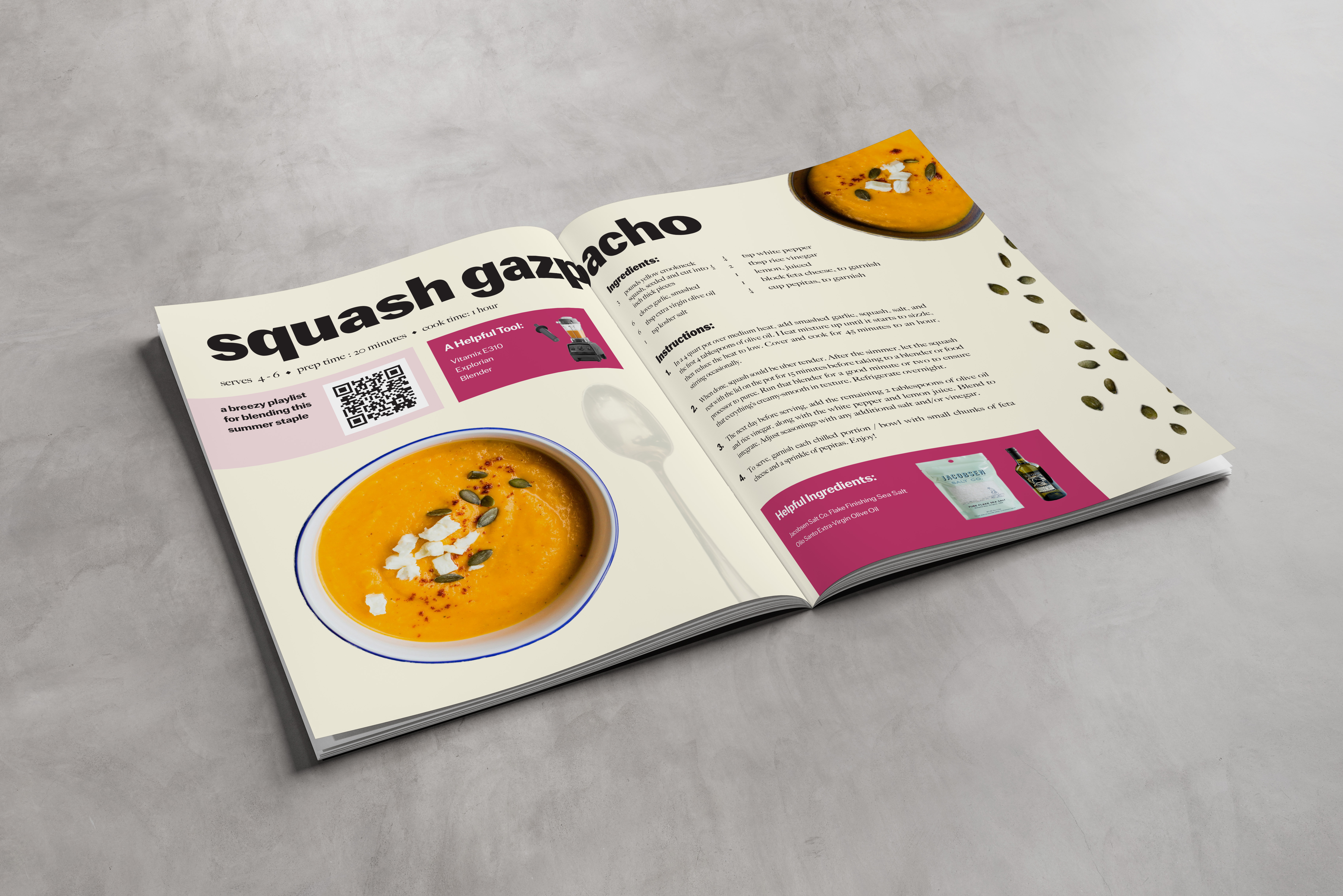 The end result of this project will be a catalog for Williams Sonoma that showcases their products in real recipe scenarios. The images that go with the recipes will show both the recipes along with the showcased products being used. I am also planning to curate playlists to go along with each recipe as the user creates the dishes. Deliverables will include a print version of brand curated recipe book catalog containing specific showcased products available to purchase along with curated playlists. I will be creating an ebook / PDF version of this book as well. The curated playlists that correspond to each recipe / product page will be availble via Spotify as well.